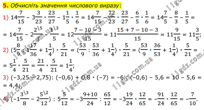 Обчисліть значення числового виразу: 1) 147/15 – 33/23 ∙ 23/27 – 11/5 ∙ 1/6 = 147/15 – 72/23 ∙ 23/27 – 6/5 ∙ 1/6 = 147/5 – 8/3 – 1/5 = = 147/15 – 22^(\5)/3 – 1^(\3)/5 = 12(7 - 10 - 3)/15 = 11(15 + 7 - 10 - 3)/15 = 119/15 = 113/5; 2) (58/9 : 117/36 + 11/4) ∙ 5/21 = (53/9 : 53/36 + 11/4) ∙ 5/21 = (53/9 ∙ 36/53 + 11/4) ∙ 5/21 = = 51/4 ∙ 5/21 = 21/4 ∙ 5/21 = 11/4; 3) (–3,25 – 2,75): (–0,6) + 0,8 ∙ (–7) = –6 : (–0,6) – 5,6 = 10 – 5,6 = = 4,4; 4) (–13^(\3)/8 – 25^(\2)/12) : 55/12 = –3(9+10)/24 : 65/12 = –319/24 ∙ 12/65 = –91/24 ∙ 12/65 = –7/10.