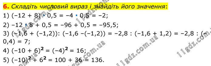Складіть числовий вираз і знайдіть його значення: 1) (–12 + 8) ∙ 0,5 = –4 ∙ 0,5 = –2; 2) –12 ∙ 8 + 0,5 = –96 + 0,5 = –95,5; 3) (–1,6 + (–1,2)): (–1,6 –(–1,2)) = –2,8 : (–1,6 + 1,2) = –2,8 : (–0,4) = 7; 4) (–10 + 6)2 = (–4)2 = 16; 5) (–10)2 + 62 = 100 + 36 = 136.