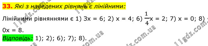 Які з наведених рівнянь є лінійними: Лінійними рівняннями є 1) Зх = 6; 2) х = 4; 6) (1 )/4х = 2; 7) х = 0; 8) 0х = 8. Відповідь: 1); 2); 6); 7); 8).