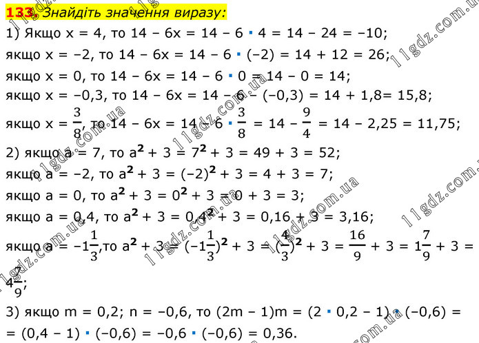 Знайдіть значення виразу: 1) Якщо х = 4, то 14 – 6х = 14 – 6 ∙ 4 = 14 – 24 = –10; якщо х = –2, то 14 – 6х = 14 – 6 ∙ (–2) = 14 + 12 = 26; якщо х = 0, то 14 – 6x = 14 – 6 ∙ 0 = 14 – 0 = 14; якщо х = –0,3, то 14 – 6х = 14 – 6 – (–0,3) = 14 + 1,8= 15,8; якщо х = 3/8, то 14 – 6х = 14 – 6 ∙ 3/8 = 14 – 9/4 = 14 – 2,25 = 11,75; 2) якщо а = 7, то а2 + 3 = 72 + 3 = 49 + 3 = 52; якщо а = –2, то а2 + 3 = (–2)2 + 3 = 4 + 3 = 7; якщо а = 0, то а2 + 3 = 02 + 3 = 0 + 3 = 3; якщо а = 0,4, то а2 + 3 = 0,42 + 3 = 0,16 + 3 = 3,16; якщо а = –11/3,то а2 + 3 = (–11/3)2 + 3 = (4/3)2 + 3 = 16/9 + 3 = 17/9 + 3 = 47/9; 3) якщо m = 0,2; n = –0,6, то (2m – 1)m = (2 ∙ 0,2 – 1) ∙ (–0,6) = = (0,4 – 1) ∙ (–0,6) = –0,6 ∙ (–0,6) = 0,36.
