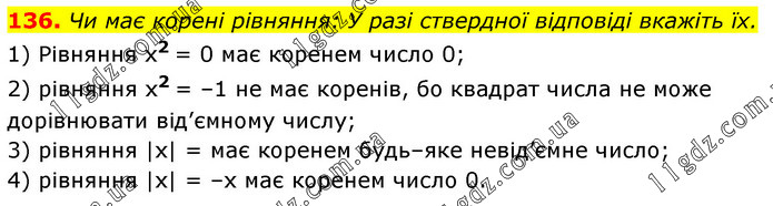 Чи має корені рівняння: У разі ствердної відповіді вкажіть їх. 1) Рівняння х2 = 0 має коренем число 0; 2) рівняння х2 = –1 не має коренів, бо квадрат числа не може дорівнювати від’ємному числу; 3) рівняння |х| = має коренем будь–яке невід’ємне число; 4) рівняння |х| = –х має коренем число 0.