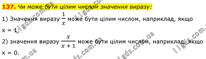 Чи може бути цілим числом значення виразу: 1) Значення виразу 1/x може бути цілим числом, наприклад, якщо х = 1; 2) значення виразу x/(x + 1) може бути цілим числом, наприклад, якщо х = 0.