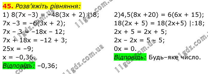 Розв’яжіть рівняння: 1) 8(7х –3) = –48(3х + 2) |:8; 7х –3 = –6(Зх + 2); 7х – 3 = –18х – 12; 7х + 18х = –12 + 3; 25х = –9; х = –0,36. Відповідь: –0,36; 2)4,5(8х +20) = 6(6х + 15); 18(2х + 5) = 18(2х+5) |:18; 2х + 5 = 2х + 5; 2х – 2х = 5 – 5; 0х = 0. Відповідь: Будь–яке число.