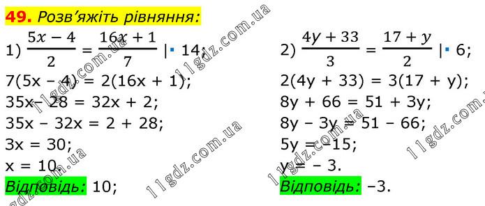 Розв’яжіть рівняння: 1) (5x - 4)/2 = (16x + 1)/7 |· 14; 7(5х – 4) = 2(16х + 1); 35х– 28 = 32х + 2; 35х – 32х = 2 + 28; Зх = З0; х = 10. Відповідь: 10; 2) (4у + 33)/3 = (17 + y)/2 |· 6; 2(4у + 33) = 3(17 + у); 8у + 66 = 51 + Зу; 8у – Зу = 51 – 66; 5у = –15; у = – 3. Відповідь: –3.