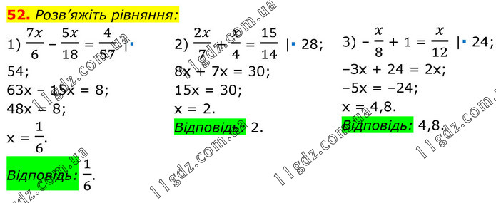 Розв’яжіть рівняння: 1) 7x/6 – 5x/18 = 4/57 |· 54; 63х – 15x = 8; 48x = 8; x = 1/6. Відповідь: 1/6. 2) 2x/7 + x/4 = 15/14 |∙ 28; 8х + 7х = 30; 15x = 30; х = 2. Відповідь: 2. 3) – x/8 + 1 = x/12 |∙ 24; –Зх + 24 = 2х; –5х = –24; х = 4,8. Відповідь: 4,8.