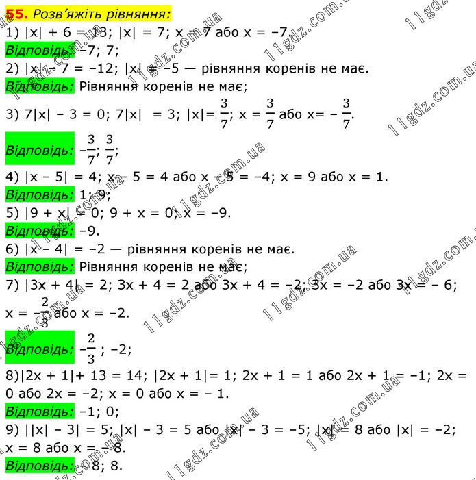 Розв’яжіть рівняння: 1) |х| + 6 = 13; |х| = 7; х = 7 або х = –7. Відповідь: –7; 7; 2) |х| – 7 = –12; |х| = –5 — рівняння коренів не має. Відповідь: Рівняння коренів не має; 3) 7|х| – 3 = 0; 7|х| = 3; |х|= 3/7; х = 3/7 або х= – 3/7. Відповідь: –3/7; 3/7; 4) |х – 5| = 4; х – 5 = 4 або x – 5 = –4; x = 9 або х = 1. Відповідь: 1; 9; 5) |9 + х| = 0; 9 + x = 0; x = –9. Відповідь: –9. 6) |х – 4| = –2 — рівняння коренів не має. Відповідь: Рівняння коренів не має; 7) |3х + 4| = 2; Зх + 4 = 2 або Зх + 4 = –2; Зх = –2 або Зх = – 6; х = –2/3 або х = –2. Відповідь: –2/3 ; –2; 8)|2х + 1|+ 13 = 14; |2х + 1|= 1; 2х + 1 = 1 або 2х + 1 = –1; 2х = 0 або 2х = –2; х = 0 або х = – 1. Відповідь: –1; 0; 9) ||х| – 3| = 5; |х| – 3 = 5 або |х| – 3 = –5; |х| = 8 або |х| = –2; х = 8 або х = – 8. Відповідь: – 8; 8.