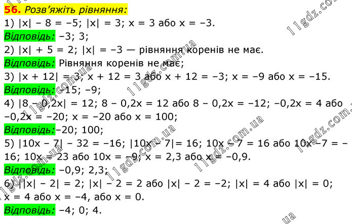 Розв’яжіть рівняння: 1) |х| – 8 = –5; |х| = 3; х = 3 або х = –3. Відповідь: –3; 3; 2) |х| + 5 = 2; |х| = –3 — рівняння коренів не має. Відповідь: Рівняння коренів не має; 3) |х + 12| = 3; х + 12 = 3 або х + 12 = –3; х = –9 або х = –15. Відповідь: –15; –9; 4) |8 – 0,2х| = 12; 8 – 0,2х = 12 або 8 – 0,2x = –12; –0,2x = 4 або –0,2x = –20; x = –20 або x = 100; Відповідь:–20; 100; 5) |10x – 7| – 32 = –16; |10x – 7|= 16; 10х – 7 = 16 або 10х –7 = –16; 10х = 23 або 10х = –9; х = 2,3 або х = –0,9. Відповідь: –0,9; 2,3; 6) ||х| – 2| = 2; |х| – 2 = 2 або |х| – 2 = –2; |х| = 4 або |х| = 0; х = 4 або х = –4, або x = 0. Відповідь: –4; 0; 4.