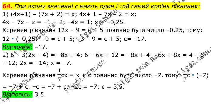 При якому значенні c мають один і той самий корінь рівняння: 1) (4х+1) – (7х + 2) = х; 4х+ 1 – 7х – 2 = х; 4х – 7х – х = –1 + 2; –4x = 1; х = –0,25. Коренем рівняння 12х – 9 = с + 5 повинно бути число –0,25, тому: 12 ∙ (–0,25) – 9 = с + 5; –3 – 9 = с + 5; с= –17. Відповідь: –17. 2) 6 – 3(2х – 4) = –8х + 4; 6 – 6x + 12 = –8х + 4; –6х + 8х = 4 – 6 – – 12; 2х = –14; х = –7. Коренем рівняння 1/7сх = х + с повинно бути число –7, тому: 1/7с ∙ (–7) = –7 + с; –с = –7 + с; –2с = –7; с = 3,5. Відповідь: 3,5.