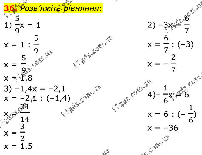 Розв’яжіть рівняння: 1) 5/9х = 1 х = 1 : 5/9 х = 5/9 х = 1,8 2) –3х = 6/7 х = 6/7 : (–3) х = – 2/7 3) –1,4х = –2,1 х = –2,1 : (–1,4) х = 21/14 х = 3/2 х = 1,5 4)– 1/6х = 6 х = 6 : (– 1/6) х = –36
