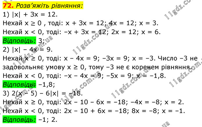 Розв’яжіть рівняння: 1) |х| + Зх = 12. Нехай х ≥ 0 , тоді: х + Зх = 12; 4х = 12; х = 3. Нехай х < 0, тоді: –х + Зх = 12; 2х = 12; х = 6. Відповідь: 3; 2) |х| – 4х = 9. Нехай х ≥ 0, тоді: х – 4х = 9; –Зх = 9; х = –3. Число –3 не задовольняє умову х ≥ 0, тому –3 не є коренем рівняння. Нехай х < 0, тоді: –х – 4х = 9; –5х = 9; х = –1,8. Відповідь: –1,8; 3) 2(х – 5) – 6|х| = –18. Нехай х ≥ 0, тоді: 2х – 10 – 6х = –18; –4х = –8; х = 2. Нехай х < 0, тоді: 2х – 10 + 6х = –18; 8х = –8; х = –1. Відповідь: –1; 2.