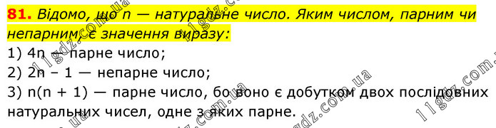 Відомо, що n — натуральне число. Яким числом, парним чи непарним, є значення виразу: 1) 4n — парне число; 2) 2n – 1 — непарне число; 3) n(n + 1) — парне число, бо воно є добутком двох послідовних натуральних чисел, одне з яких парне.