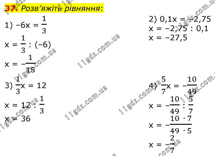 Розв’яжіть рівняння: 1) –6х = 1/3 х = 1/3 : (–6) х = –1/15 2) 0,1х = –2,75 х = –2,75 : 0,1 х = –27,5 3) 1/3х = 12 х = 12 : 1/3 х = 36 4) 5/7х = –10/49 х = –10/49 : 5/7 х = –(10 ∙ 7)/(49 ∙ 5) х = –2/7