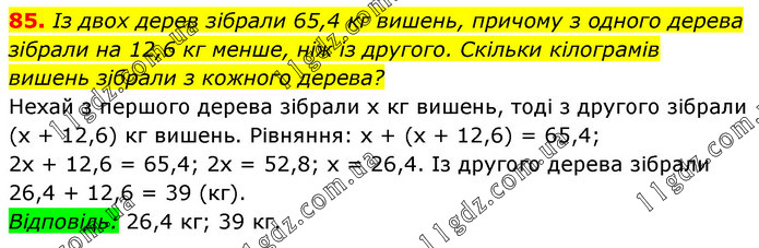 Із двох дерев зібрали 65,4 кг вишень, причому з одного дерева зібрали на 12,6 кг менше, ніж із другого. Скільки кілограмів вишень зібрали з кожного дерева? Нехай з першого дерева зібрали х кг вишень, тоді з другого зібрали (х + 12,6) кг вишень. Рівняння: х + (х + 12,6) = 65,4; 2х + 12,6 = 65,4; 2х = 52,8; х = 26,4. Із другого дерева зібрали 26,4 + 12,6 = 39 (кг). Відповідь: 26,4 кг; 39 кг.