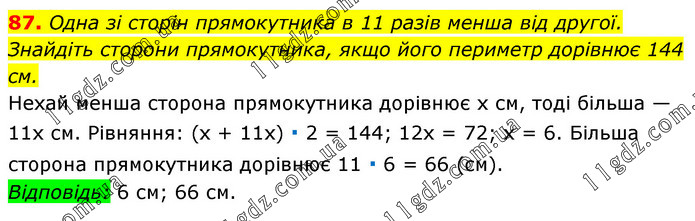 Одна зі сторін прямокутника в 11 разів менша від другої. Знайдіть сторони прямокутника, якщо його периметр дорівнює 144 см. Нехай менша сторона прямокутника дорівнює х см, тоді більша — 11х см. Рівняння: (х + 11х) ∙ 2 = 144; 12х = 72; х = 6. Більша сторона прямокутника дорівнює 11 ∙ 6 = 66 (см). Відповідь: 6 см; 66 см.