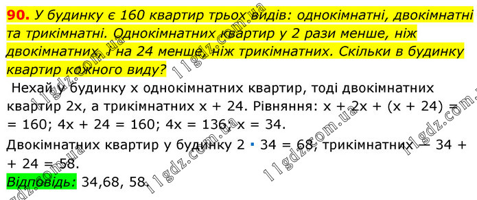 У будинку є 160 квартир трьох видів: однокімнатні, двокімнатні та трикімнатні. Однокімнатних квартир у 2 рази менше, ніж двокімнатних, і на 24 менше, ніж трикімнатних. Скільки в будинку квартир кожного виду? Нехай у будинку х однокімнатних квартир, тоді двокімнатних квартир 2х, а трикімнатних х + 24. Рівняння: х + 2х + (х + 24) = = 160; 4х + 24 = 160; 4х = 136; х = 34. Двокімнатних квартир у будинку 2 ∙ 34 = 68, трикімнатних — 34 + + 24 = 58. Відповідь: 34,68, 58.