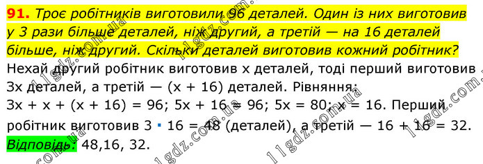 Троє робітників виготовили 96 деталей. Один із них виготовив у 3 рази більше деталей, ніж другий, а третій — на 16 деталей більше, ніж другий. Скільки деталей виготовив кожний робітник? Нехай другий робітник виготовив х деталей, тоді перший виготовив Зх деталей, а третій — (х + 16) деталей. Рівняння: Зх + х + (х + 16) = 96; 5х + 16 = 96; 5х = 80; х = 16. Перший робітник виготовив 3 ∙ 16 = 48 (деталей), а третій — 16 + 16 = 32. Відповідь: 48,16, 32.