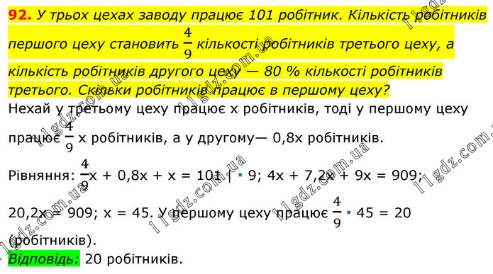 У трьох цехах заводу працює 101 робітник. Кількість робітників першого цеху становить 4/9 кількості робітників третього цеху, а кількість робітників другого цеху — 80 % кількості робітників третього. Скільки робітників працює в першому цеху? Нехай у третьому цеху працює х робітників, тоді у першому цеху працює 4/9 х робітників, а у другому— 0,8х робітників. Рівняння: 4/9х + 0,8х + х = 101 | ∙ 9; 4х + 7,2x + 9х = 909; 20,2х = 909; х = 45. У першому цеху працює 4/9 ∙ 45 = 20 (робітників). Відповідь: 20 робітників.