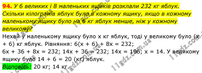 У 6 великих і 8 маленьких ящиків розклали 232 кг яблук. Скільки кілограмів яблук було в кожному ящику, якщо в кожному маленькому ящику було на 6 кг яблук менше, ніж у кожному великому? Нехай у маленькому ящику було х кг яблук, тоді у великому було (х + 6) кг яблук. Рівняння: 6(х + 6) + 8х = 232; 6х + 36 + 8х = 232; 14х + 36 = 232; 14х = 196; х = 14. У великому ящику було 14 + 6 = 20 (кг) яблук. Відповідь: 20 кг; 14 кг.