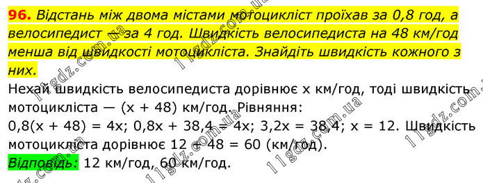 Відстань між двома містами мотоцикліст проїхав за 0,8 год, а велосипедист — за 4 год. Швидкість велосипедиста на 48 км/год менша від швидкості мотоцикліста. Знайдіть швидкість кожного з них. Нехай швидкість велосипедиста дорівнює х км/год, тоді швидкість мотоцикліста — (х + 48) км/год. Рівняння: 0,8(х + 48) = 4х; 0,8х + 38,4 = 4х; 3,2х = 38,4; х = 12. Швидкість мотоцикліста дорівнює 12 + 48 = 60 (км/год). Відповідь: 12 км/год, 60 км/год.