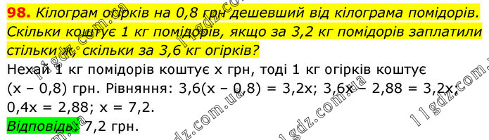 Кілограм огірків на 0,8 грн дешевший від кілограма помідорів. Скільки коштує 1 кг помідорів, якщо за 3,2 кг помідорів заплатили стільки ж, скільки за 3,6 кг огірків? Нехай 1 кг помідорів коштує х грн, тоді 1 кг огірків коштує (х – 0,8) грн. Рівняння: 3,6(х – 0,8) = 3,2х; 3,6х – 2,88 = 3,2х; 0,4х = 2,88; х = 7,2. Відповідь: 7,2 грн.