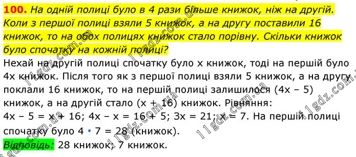 На одній полиці було в 4 рази більше книжок, ніж на другій. Коли з першої полиці взяли 5 книжок, а на другу поставили 16 книжок, то на обох полицях книжок стало порівну. Скільки книжок було спочатку на кожній полиці? Нехай на другій полиці спочатку було х книжок, тоді на першій було 4х книжок. Після того як з першої полиці взяли 5 книжок, а на другу поклали 16 книжок, то на першій полиці залишилося (4х – 5) книжок, а на другій стало (х + 16) книжок. Рівняння: 4х – 5 = х + 16; 4х – х = 16 + 5; Зх = 21; х = 7. На першій полиці спочатку було 4 ∙ 7 = 28 (книжок). Відповідь: 28 книжок; 7 книжок.