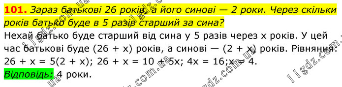 Зараз батькові 26 років, а його синові — 2 роки. Через скільки років батько буде в 5 разів старший за сина? Нехай батько буде старший від сина у 5 разів через х років. У цей час батькові буде (26 + х) років, а синові — (2 + х) років. Рівняння: 26 + х = 5(2 + х); 26 + х = 10 + 5х; 4х = 16;х = 4. Відповідь: 4 роки.