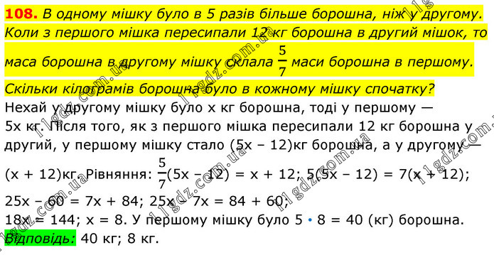 В одному мішку було в 5 разів більше борошна, ніж у другому. Коли з першого мішка пересипали 12 кг борошна в другий мішок, то маса борошна в другому мішку склала 5/7 маси борошна в першому. Скільки кілограмів борошна було в кожному мішку спочатку? Нехай у другому мішку було х кг борошна, тоді у першому — 5х кг. Після того, як з першого мішка пересипали 12 кг борошна у другий, у першому мішку стало (5х – 12)кг борошна, а у другому — (х + 12)кг. Рівняння: 5/7(5х – 12) = х + 12; 5(5х – 12) = 7(х + 12); 25х – 60 = 7х + 84; 25х – 7х = 84 + 60; 18х = 144; х = 8. У першому мішку було 5 • 8 = 40 (кг) борошна. Відповідь: 40 кг; 8 кг.