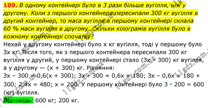 В одному контейнері було в 3 рази більше вугілля, ніж у другому. Коли з першого контейнера пересипали 300 кг вугілля в другий контейнер, то маса вугілля в першому контейнері склала 60 % маси вугілля в другому. Скільки кілограмів вугілля було в кожному контейнері спочатку? Нехай у другому контейнері було х кг вугілля, тоді у першому було Зх кг. Після того, як з першого контейнера пересипали 300 кг вугілля у другий, у першому контейнері стало (Зх – 300) кг вугілля, а у другому — (х + 300) кг. Рівняння: Зх – 300 = 0,6(х + 300); Зх – З00 = 0,6х + 180; Зх – 0,6х = 180 + 300; 2,4х = 480; х = 200. У першому контейнері було 3 ∙ 200 = 600 (кг) вугілля. Відповідь: 600 кг; 200 кг.