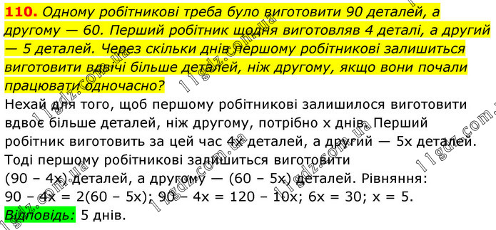 Одному робітникові треба було виготовити 90 деталей, а другому — 60. Перший робітник щодня виготовляв 4 деталі, а другий — 5 деталей. Через скільки днів першому робітникові залишиться виготовити вдвічі більше деталей, ніж другому, якщо вони почали працювати одночасно? Нехай для того, щоб першому робітникові залишилося виготовити вдвоє більше деталей, ніж другому, потрібно х днів. Перший робітник виготовить за цей час 4х деталей, а другий — 5х деталей. Тоді першому робітникові залишиться виготовити (90 – 4х) деталей, а другому — (60 – 5х) деталей. Рівняння: 90 – 4х = 2(60 – 5х); 90 – 4х = 120 – 10х; 6х = 30; х = 5. Відповідь: 5 днів.