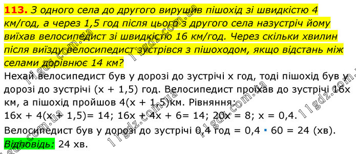З одного села до другого вирушив пішохід зі швидкістю 4 км/год, а через 1,5 год після цього з другого села назустріч йому виїхав велосипедист зі швидкістю 16 км/год. Через скільки хвилин після виїзду велосипедист зустрівся з пішоходом, якщо відстань між селами дорівнює 14 км? Нехай велосипедист був у дорозі до зустрічі х год, тоді пішохід був у дорозі до зустрічі (х + 1,5) год. Велосипедист проїхав до зустрічі 16х км, а пішохід пройшов 4(х + 1,5)км. Рівняння: 16х + 4(х + 1,5)= 14; 16х + 4х + 6= 14; 20х = 8; х = 0,4. Велосипедист був у дорозі до зустрічі 0,4 год = 0,4 ∙ 60 = 24 (хв). Відповідь: 24 хв.