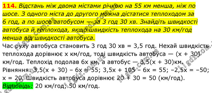 Відстань між двома містами річкою на 55 км менша, ніж по шосе. З одного міста до другого можна дістатися теплоходом за 6 год, а по шосе автобусом — за 3 год 30 хв. Знайдіть швидкості автобуса й теплохода, якщо швидкість теплохода на 30 км/год менша від швидкості автобуса. Час руху автобуса становить 3 год 30 хв = 3,5 год. Нехай швидкість теплохода дорівнює х км/год, тоді швидкість автобуса — (х + 30) км/год. Теплохід подолав 6х км, а автобус — 3,5(х + 30)км. Рівняння: 3,5(х + 30) – 6х = 55; 3,5х + 105 – 6х = 55; –2,5х = –50; х = 20. Швидкість автобуса дорівнює 20 + 30 = 50 (км/год). Відповідь: 20 км/год; 50 км/год.