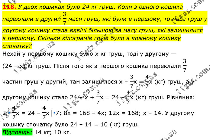 У двох кошиках було 24 кг груш. Коли з одного кошика переклали в другий 3/7 маси груш, які були в першому, то маса груш у другому кошику стала вдвічі більшою за масу груш, які залишилися в першому. Скільки кілограмів груш було в кожному кошику спочатку? Нехай у першому кошику було х кг груш, тоді у другому — (24 – х) кг груш. Після того як з першого кошика переклали 3/7 частин груш у другий, там залишилося х – 3/7х = 4/7х (кг) груш, а у другому кошику стало 24 – х + 3/7х = 24 – 4/7х (кг) груш. Рівняння: 2 ∙ 4/7х = 24 – 4/7х│∙7; 8х = 168 – 4х; 12х = 168; х – 14. У другому кошику спочатку було 24 – 14 = 10 (кг) груш. Відповідь: 14 кг; 10 кг.