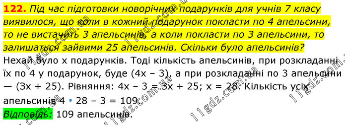 Під час підготовки новорічних подарунків для учнів 7 класу виявилося, що коли в кожний подарунок покласти по 4 апельсини, то не вистачить 3 апельсинів, а коли покласти по 3 апельсини, то залишаться зайвими 25 апельсинів. Скільки було апельсинів? Нехай було х подарунків. Тоді кількість апельсинів, при розкладанні їх по 4 у подарунок, буде (4х – 3), а при розкладанні по 3 апельсини — (Зх + 25). Рівняння: 4х – 3 = Зх + 25; х = 28. Кількість усіх апельсинів 4 ∙ 28 – 3 = 109. Відповідь: 109 апельсинів.