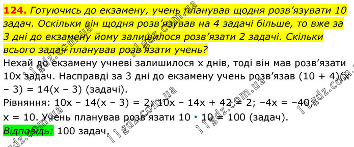 Готуючись до екзамену, учень планував щодня розв’язувати 10 задач. Оскільки він щодня розв’язував на 4 задачі більше, то вже за 3 дні до екзамену йому залишилося розв’язати 2 задачі. Скільки всього задач планував розв’язати учень? Нехай до екзамену учневі залишилося х днів, тоді він мав розв’язати 10х задач. Насправді за 3 дні до екзамену учень розв’язав (10 + 4)(х – 3) = 14(х – 3) (задачі). Рівняння: 10х – 14(х – 3) = 2; 10х – 14х + 42 = 2; –4х = –40; х = 10. Учень планував розв’язати 10 ∙ 10 = 100 (задач). Відповідь: 100 задач.