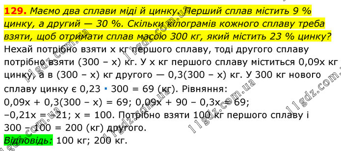 Маємо два сплави міді й цинку. Перший сплав містить 9 % цинку, а другий — 30 %. Скільки кілограмів кожного сплаву треба взяти, щоб отримати сплав масою 300 кг, який містить 23 % цинку? Нехай потрібно взяти х кг першого сплаву, тоді другого сплаву потрібно взяти (300 – х) кг. У х кг першого сплаву міститься 0,09х кг цинку, а в (300 – х) кг другого — 0,3(300 – х) кг. У 300 кг нового сплаву цинку є 0,23 ∙ 300 = 69 (кг). Рівняння: 0,09х + 0,3(300 – х) = 69; 0,09х + 90 – 0,3х = 69; –0,21х = –21; х = 100. Потрібно взяти 100 кг першого сплаву і 300 – 100 = 200 (кг) другого. Відповідь: 100 кг; 200 кг.