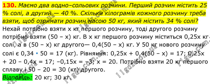 Маємо два водно–сольових розчини. Перший розчин містить 25 % солі, а другий — 40 %. Скільки кілограмів кожного розчину треба взяти, щоб отримати розчин масою 50 кг, який містить 34 % солі? Нехай потрібно взяти х кг першого розчину, тоді другого розчину потрібно взяти (50 – х) кг. В х кг першого розчину міститься 0,25х кг солі, а в (50 – х) кг другого— 0,4(50 – х) кг. У 50 кг нового розчину солі є 0,34 ∙ 50 = 17 (кг). Рівняння: 0,25х + 0,4(50 – х) = 17; 0,25х + 20 – 0,4х = 17; –0,15х = –3; х = 20. Потрібно взяти 20 кг першого сплаву і 50 – 20 = 30 (кг) другого. Відповідь: 20 кг; 30 кг.