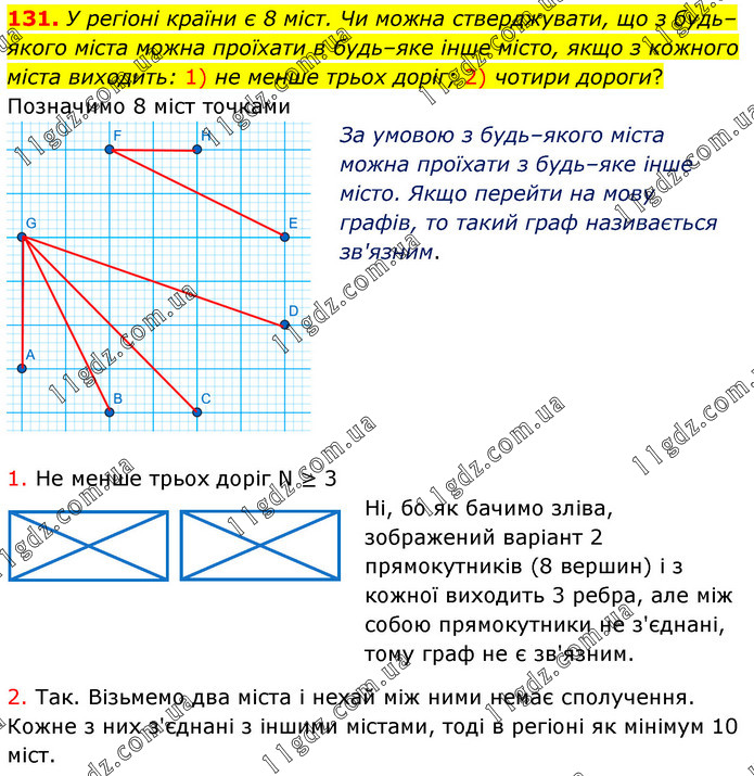 У регіоні країни є 8 міст. Чи можна стверджувати, що з будь–якого міста можна проїхати в будь–яке інше місто, якщо з кожного міста виходить: 1) не менше трьох доріг; 2) чотири дороги? Позначимо 8 міст точками За умовою з будь–якого міста можна проїхати з будь–яке інше місто. Якщо перейти на мову графів, то такий граф називається зв'язним. 1. Не менше трьох доріг N ≥ 3 Ні, бо як бачимо зліва, зображений варіант 2 прямокутників (8 вершин) і з кожної виходить 3 ребра, але між собою прямокутники не з'єднані, тому граф не є зв'язним. 2. Так. Візьмемо два міста і нехай між ними немає сполучення. Кожне з них з'єднані з іншими містами, тоді в регіоні як мінімум 10 міст.