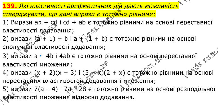 Які властивості арифметичних дій дають можливість стверджувати, що дані вирази є тотожно рівними: 1) Вирази аb + сd і сd + аb є тотожно рівними на основі переставної властивості додавання; 2) вирази (a + 1) + b і а + (1 + b) є тотожно рівними на основі сполучної властивості додавання; 3) вирази a · 4b і 4аb є тотожно рівними на основі переставної властивості множення; 4) вирази (x + 2)(х + 3) і (3 + х)(2 + х) є тотожно рівними на основі переставних властивостей додавання і множення; 5) вирази 7(а – 4) і 7a – 28 є тотожно рівними на основі розподільної властивості множення відносно додавання.