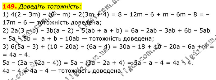 Доведіть тотожність: 1) 4(2 – Зm) – (6 – m) – 2(3m + 4) = 8 – 12m – 6 + m – 6m – 8 = –17m – 6 — тотожність доведена; 2) 2а(3 – b) – 3b(а – 2) – 5(ab + а + b) = 6а – 2ab – 3ab + 6b – 5аb – 5а – 5b = а + b – 10аb — тотожність доведена; 3) 6(5а – 3) + (10 – 20а) – (6а – 4) = 30а – 18 + 10 – 20а – 6а + 4 = = 4а – 4. 5а – (За – (2а – 4)) = 5а – (За – 2а + 4) = 5а – а – 4 = 4а – 4. 4а – 4 = 4а – 4 — тотожність доведена.