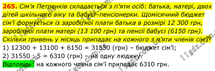Сім’я Петренків складається з п’яти осіб: батька, матері, двох дітей шкільного віку та бабусі–пенсіонерки. Щомісячний бюджет сім’ї формується із заробітної плати батька в розмірі 12 300 грн, заробітної плати матері (13 100 грн) та пенсії бабусі (6150 грн). Скільки гривень у місяць припадає на кожного з п’яти членів сім’ї? 1) 12300 + 13100 + 6150 = 31550 (грн) – бюджет сім’ї; 2) 31550 : 5 = 6310 (грн) – на одну людину. Відповідь: на кожного члена сім’ї припадає 6310 грн.