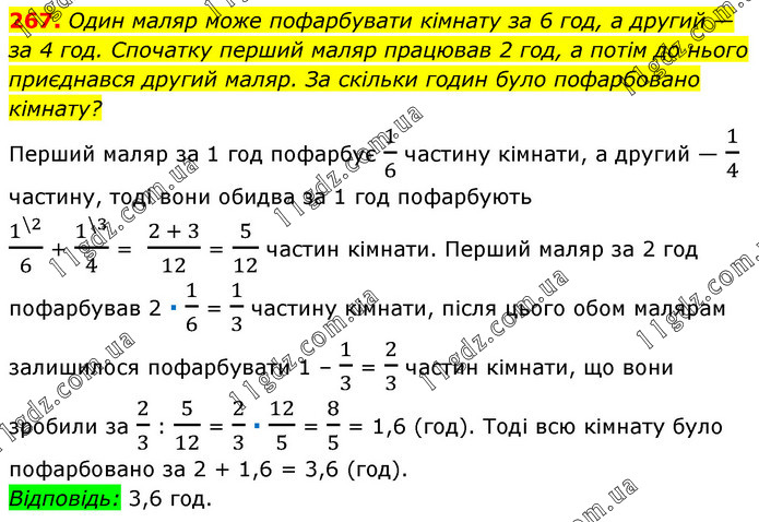 Один маляр може пофарбувати кімнату за 6 год, а другий — за 4 год. Спочатку перший маляр працював 2 год, а потім до нього приєднався другий маляр. За скільки годин було пофарбовано кімнату? Перший маляр за 1 год пофарбує 1/6 частину кімнати, а другий — 1/4 частину, тоді вони обидва за 1 год пофарбують 1^(\2)/6 + 1^(\3)/4 = (2 + 3)/12 = 5/12 частин кімнати. Перший маляр за 2 год пофарбував 2 ∙ 1/6 = 1/3 частину кімнати, після цього обом малярам залишилося пофарбувати 1 – 1/3 = 2/3 частин кімнати, що вони зробили за 2/3 : 5/12 = 2/3 ∙ 12/5 = 8/5 = 1,6 (год). Тоді всю кімнату було пофарбовано за 2 + 1,6 = 3,6 (год). Відповідь: 3,6 год.