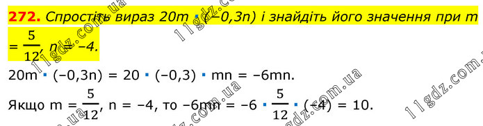Спростіть вираз 20m ∙ (−0,3n) і знайдіть його значення при m = 5/12, n = –4. 20m ∙ (–0,3n) = 20 ∙ (–0,3) ∙ mn = –6mn. Якщо m = 5/12, n = –4, то –6mn = –6 ∙ 5/12 ∙ (–4) = 10.