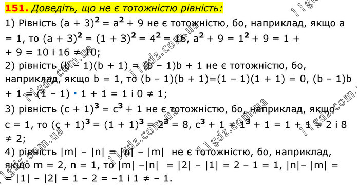Доведіть, що не є тотожністю рівність: 1) Рівність (а + 3)2 = а2 + 9 не є тотожністю, бо, наприклад, якщо а = 1, то (а + З)2 = (1 + З)2 = 42 = 16, а2 + 9 = 12 + 9 = 1 + + 9 = 10 і 16 ≠ 10; 2) рівність (b – 1)(b + 1) = (b – 1)b + 1 не є тотожністю, бо, наприклад, якщо b = 1, то (b – 1)(b + 1)=(1 – 1)(1 + 1) = 0, (b – 1)b + 1 = (1 – 1) ∙ 1 + 1 = 1 i 0 ≠ 1; 3) рівність (с + 1)3 = с3 + 1 не є тотожністю, бо, наприклад, якщо с = 1, то (с + 1)3 = (1 + 1)3 = 23 = 8, с3 + 1 = 13 + 1 = 1 + 1 = 2 і 8 ≠ 2; 4) рівність |m| – |n| = |n| – |m| не є тотожністю, бо, наприклад, якщо m = 2, n = 1, то |m| –|n| = |2| – |1| = 2 – 1 = 1, |n|– |m| = = |1| – |2| = 1 – 2 = –1 і 1 ≠ – 1.
