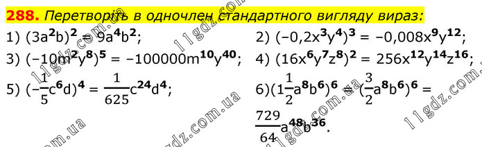 Перетворіть в одночлен стандартного вигляду вираз: 1) (3a2b)2 = 9a4b2; 3) (–10m2y8)5 = –100000m10y40; 5) (–1/5c6d)4 = 1/625c24d4; 2) (–0,2x3y4)3 = –0,008x9y12; 4) (16x6y7z8)2 = 256x12y14z16; 6)(11/2a8b6)6 = (3/2a8b6)6 = 729/64a48b36.