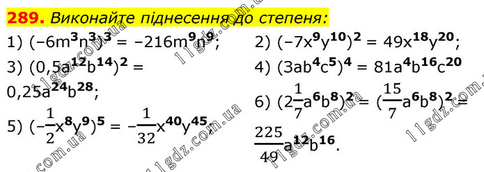 Виконайте піднесення до степеня: 1) (–6m3n3)3 = –216m9n9; 3) (0,5a12b14)2 = 0,25а24b28; 5) (–1/2x8y9)5 = –1/32x40y45; 2) (–7x9y10)2 = 49х18у20; 4) (Зab4с5)4 = 81a4b16с20 6) (21/7a6b8)2 = (15/7a6b8)2 = 225/49a12b16.