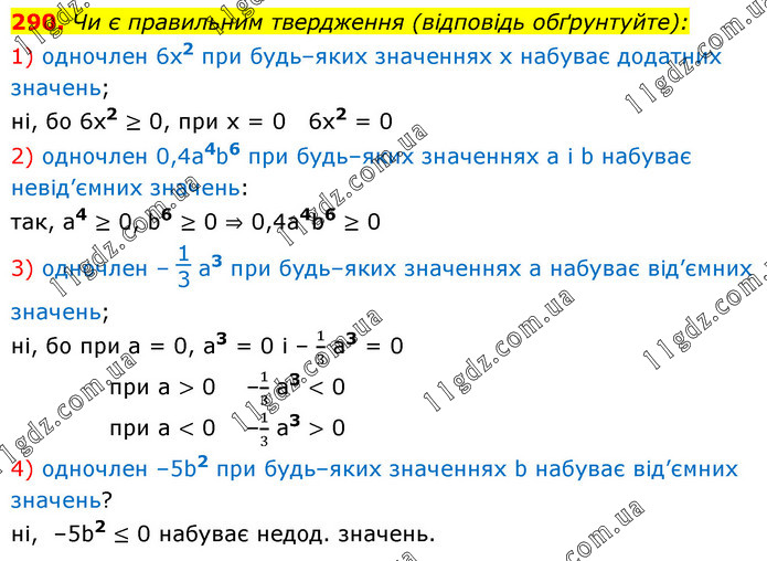 Чи є правильним твердження (відповідь обґрунтуйте): 1) одночлен 6x2 при будь–яких значеннях x набуває додатних значень; ні, бо 6х2 ≥ 0, при х = 0 6х2 = 0 2) одночлен 0,4a4b6 при будь–яких значеннях a і b набуває невід’ємних значень: так, а4 ≥ 0, b6 ≥ 0 ⇒ 0,4a4b6 ≥ 0 3) одночлен – 13 а3 при будь–яких значеннях a набуває від’ємних значень; ні, бо при а = 0, а3 = 0 і – 1/3 а3 = 0 при а > 0 –1/3 а3 < 0 при а < 0 –1/3 а3 > 0 4) одночлен –5b2 при будь–яких значеннях b набуває від’ємних значень? ні, –5b2 ≤ 0 набуває недод. значень.