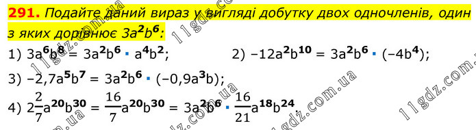 Подайте даний вираз у вигляді добутку двох одночленів, один з яких дорівнює 3a2b6: 1) 3a6b8 = 3a2b6 ∙ a4b2; 2) –12a2b10 = 3a2b6 ∙ (–4b4); 3) –2,7a5b7 = 3a2b6 ∙ (–0,9a3b); 4) 22/7a20b30 = 16/7a20b30 = 3a2b6 ∙ 16/21a18b24.