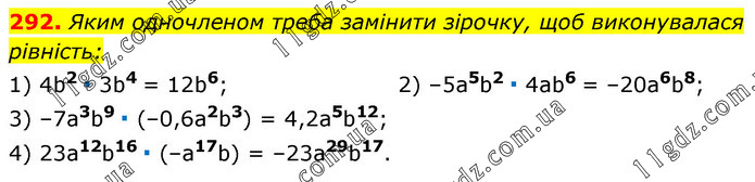 Яким одночленом треба замінити зірочку, щоб виконувалася рівність: 1) 4b2 ∙ 3b4 = 12b6; 2) –5a5b2 ∙ 4ab6 = –20a6b8; 3) –7a3b9 ∙ (–0,6a2b3) = 4,2a5b12; 4) 23a12b16 ∙ (–a17b) = –23a29b17.