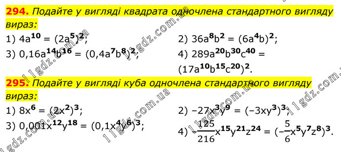 294. Подайте у вигляді квадрата одночлена стандартного вигляду вираз: 1) 4a10 = (2a5)2; 3) 0,16a14b16 = (0,4a7b8)2; 2) 36a8b2 = (6a4b)2; 4) 289a20b30c40 = (17a10b15c20)2. 295. Подайте у вигляді куба одночлена стандартного вигляду вираз: 1) 8x6 = (2x2)3; 3) 0,001x12y18 = (0,1x4y6)3; 2) –27x3y9 = (–3xy3)3; 4) –125/216x15y21z24 = (–5/6x5y7z8)3.