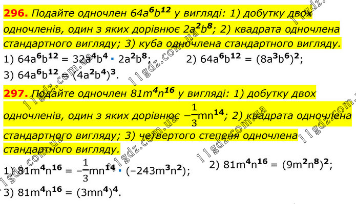 296. Подайте одночлен 64a6b12 у вигляді: 1) добутку двох одночленів, один з яких дорівнює 2a2b8; 2) квадрата одночлена стандартного вигляду; 3) куба одночлена стандартного вигляду. 1) 64a6b12 = 32a4b4 ∙ 2a2b8; 3) 64a6b12 = (4a2b4)3. 2) 64a6b12 = (8a3b6)2; 297. Подайте одночлен 81m4n16 у вигляді: 1) добутку двох одночленів, один з яких дорівнює −1/3mn14; 2) квадрата одночлена стандартного вигляду; 3) четвертого степеня одночлена стандартного вигляду. 1) 81m4n16 = –1/3mn14 ∙ (–243m3n2); 3) 81m4n16 = (3mn4)4. 2) 81m4n16 = (9m2n8)2;